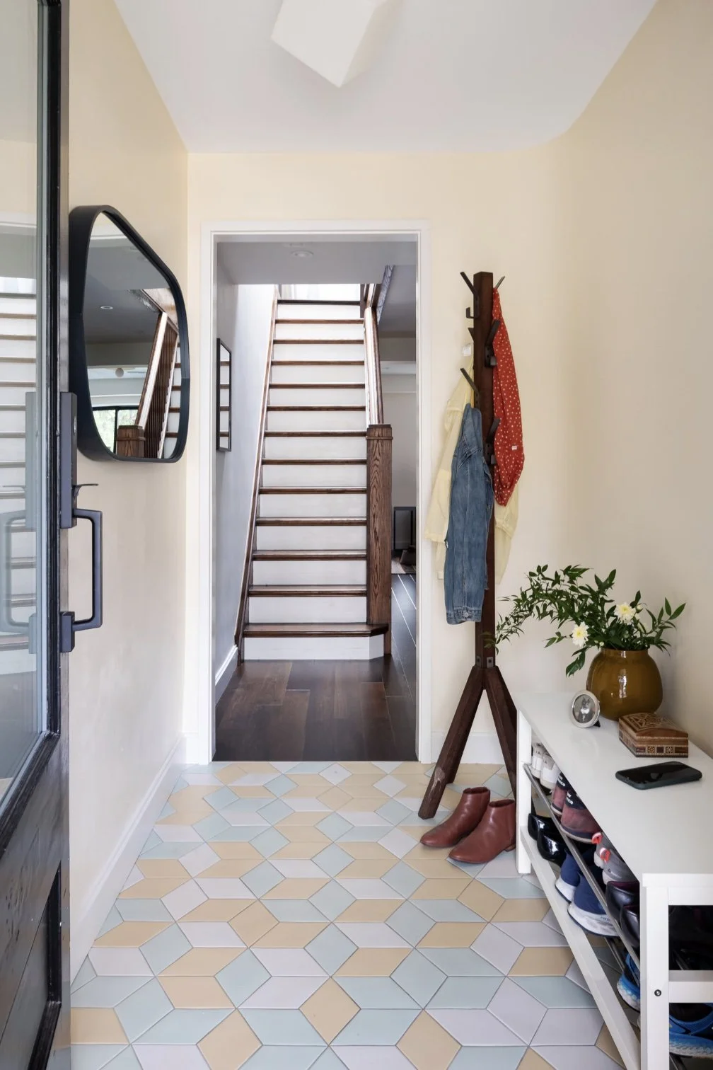 Since the entrance room will see a lot of heavy use, use durable materials, like tile on the floor or wood wainscotting on the walls. At the foyer, take care to make an impression with nice fixtures, patterns, and colours, and consider hanging a beautiful wallpaper.