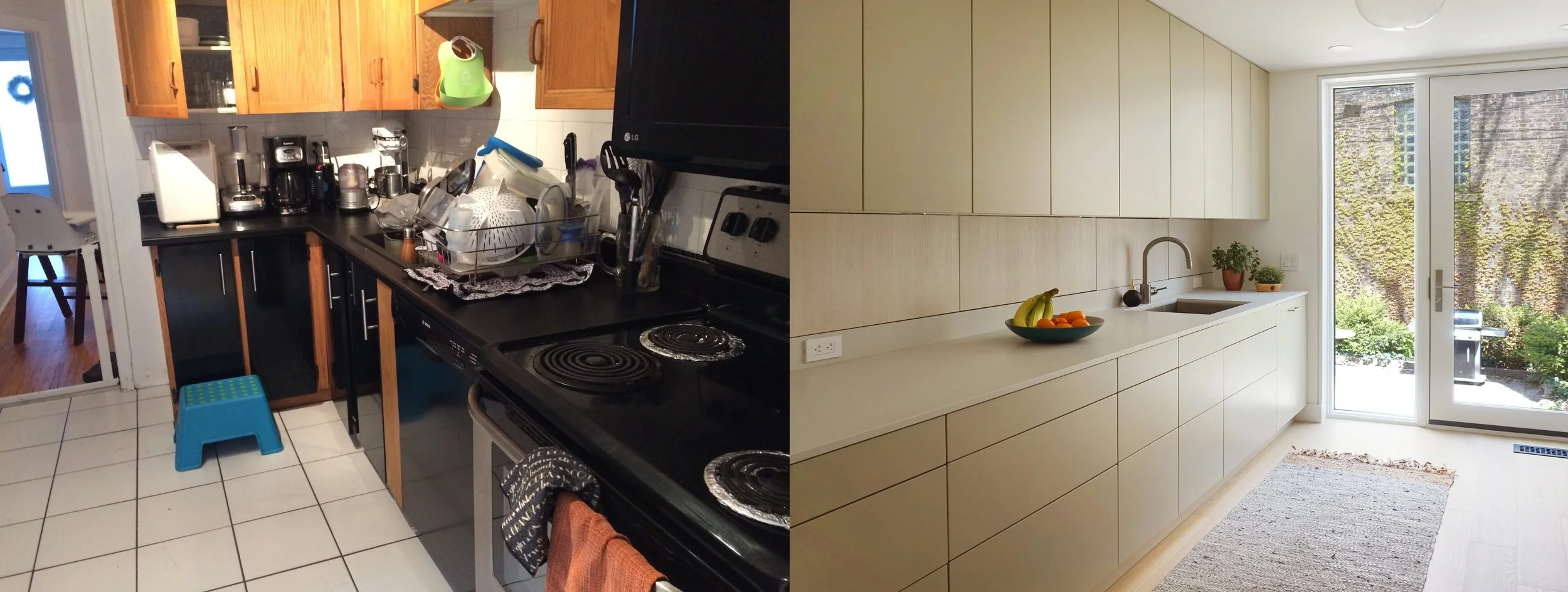 The typical old Toronto house follows a familiar order on the ground floor: living room at the front, dining room in the middle, and kitchen at the back. Our clients came to us to revive their kitchen in its back-of-house location, with the priorities of maximizing storage and bringing in natural light. Rather than introducing a narrow island into the compact kitchen footprint, we suggested a row of intermediate cabinets to take the place of the typical backsplash. This move adds a new strata of storage between base and upper cabinets, allowing for small appliances and every day items to be easily stored, and freeing up counterspace for working.